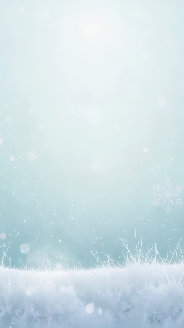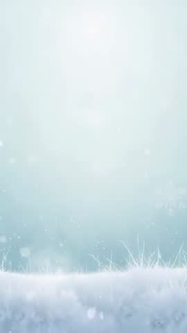 AI Generated Video. Vertical 9:16 winter video showing soft blue gradient sky, gentle falling snow, frosty grass foreground, subtle bokeh highlights and floating snow particles. Mood conveying calm, chilly, serene atmosphere with minimalist composition and ample negative space for text or graphics. Ideal for use in social media stories, Instagram Reels, TikTok, mobile ads, holiday sale promotions, seasonal greeting animations, event invitations, website hero banners, and background for product overlays. Easy to loop and blend with title cards, lower thirds, or animated typography; compatible with color grading and light leak overlays for custom branding.