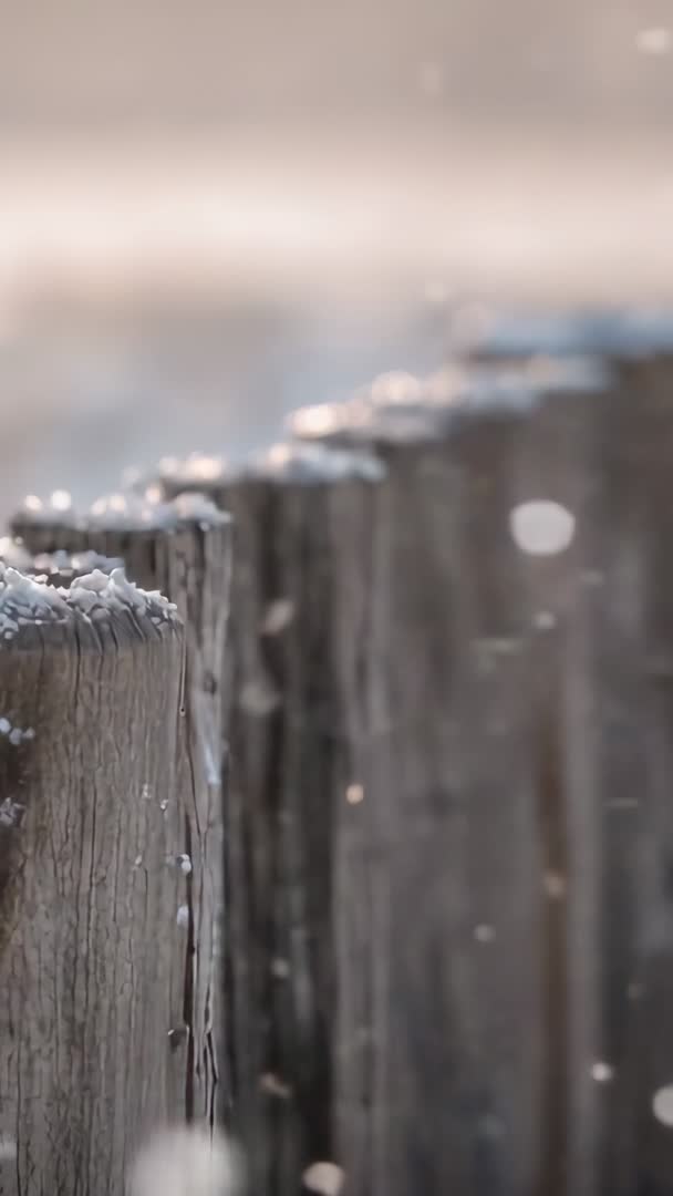 AI Generated Video. Vertical video capturing falling snowflakes drifting across weathered wooden posts on dock, creating soft bokeh and muted winter palette. Close-up composition emphasizing textured wood grain and top edges dusted with snow, while shallow depth of field pushing background into gentle blur. Tall vertical frame offering generous copy space in upper area for titles, captions, or app overlays. Suiting seasonal marketing, fueling social media reels, enhancing smartphone ads, and anchoring website hero banners and calming B-roll for travel or lifestyle projects. Easily integrating with slow-motion edits, subtle color grading to enhance cool tones, and text or logo overlays. Mood suggestions: tranquil, reflective, crisp winter calm.