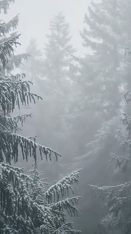 AI Generated Video. Vertical clip showing snow-laden spruce branches in foreground with layered fir silhouettes receding into dense mist. Soft diffused light creating moody, atmospheric winter mood with snow clinging to evergreen needles. Slow, cinematic movement and tall composition making clip ideal for vertical platforms and short-form video. Usage suggestions include using as background for winter travel reels, holiday campaigns, seasonal product launches, meditation and wellness clips, and social media shorts. Using as B-roll for nature documentaries, weather reports, environmental storytelling, and scenic montages. Applying slow zoom or parallax for dramatic effect, adding subtle ambient music or soft narration for mood, and overlaying minimal text for title cards or quotes. Looping short segments for calming backgrounds in retail displays, virtual events, or wellness apps. Technical notes: preferring slow frame rate and smooth stabilization when adding overlay graphics, keeping negative space in upper center for text and logos, optimizing clip for vertical 9:16 aspect ratio projects, and color grading toward cool blue tones for enhanced winter feel.