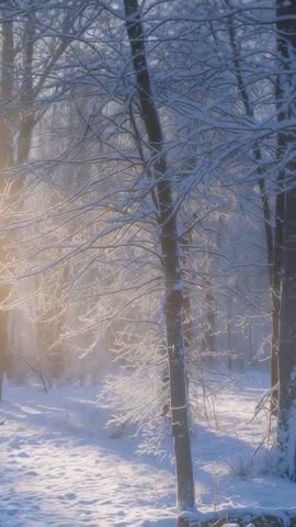 AI Generated Video. Vertical footage showing solitary tree trunk catching low sunbeam, branches coated with fresh snow, light casting warm golden glow and causing snow crystals to sparkle. Soft haze and long shadows forming as sun moves through canopy, creating depth and cinematic mood. Clip suiting mobile-first projects such as social media stories, reels, vertical ads, and mobile wallpapers. Also suiting meditation and mindfulness apps, seasonal commercials, travel and nature documentaries, winter holiday promotions, website hero banners, and calming loops for public spaces. Footage allowing slow-motion and subtle time-lapse edits, supporting color grading toward cool blue or warm amber palettes depending on mood. Providing use case ideas: background for inspirational quotes and text overlays, opener for environmental or seasonal videos, visual texture for product ads, ambient clip for guided relaxation. Original footage captured vertically, optimized for mobile viewing and social distribution.
