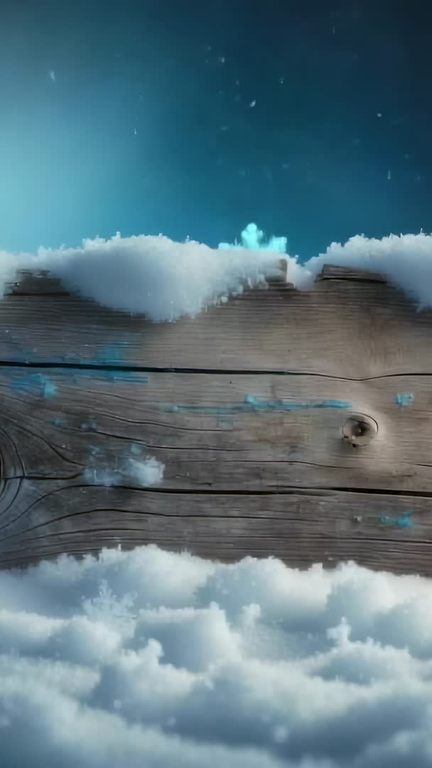AI Generated Image. Vertical video featuring glowing six-point snowflakes drifting across frosted wooden plank, settling into soft snowdrifts and creating tranquil winter ambience against cool teal sky. Working well for social media reels, mobile wallpapers, holiday greeting animations, seasonal marketing campaigns, and looping website backgrounds. Providing cinematic shallow depth and natural wood texture while leaving central area for logo, headline, or text overlay. Serving well in product presentations, winter promotions, meditation or relaxation sequences, and festive intro/outro pieces.