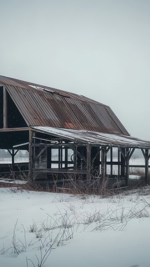 AI Generated Video. Vertical clip showing light snowfall drifting across weathered wooden barn with rusted metal roof in snowy field. Framing emphasizing vertical composition and exposed interior beams, conveying desolate rural atmosphere and quiet isolation. Color palette featuring muted grays and rusty browns, creating moody, cinematic tone. Serving well for background footage in winter travel stories, rural documentary B-roll, social media reels, Instagram and TikTok vertical ads, homepage hero banners with overlay text, album or book cover art, real estate restoration before-and-after sequences, editorial pieces about abandonment, seasonal change, heritage preservation. Pairing with slow-motion pacing, cold color grading, subtle ambient soundtrack, and lower-third title overlays to enhance melancholic mood. Leaving safe area at bottom for captions and logo placement and allowing easy vertical crop adjustments for mobile-first projects.