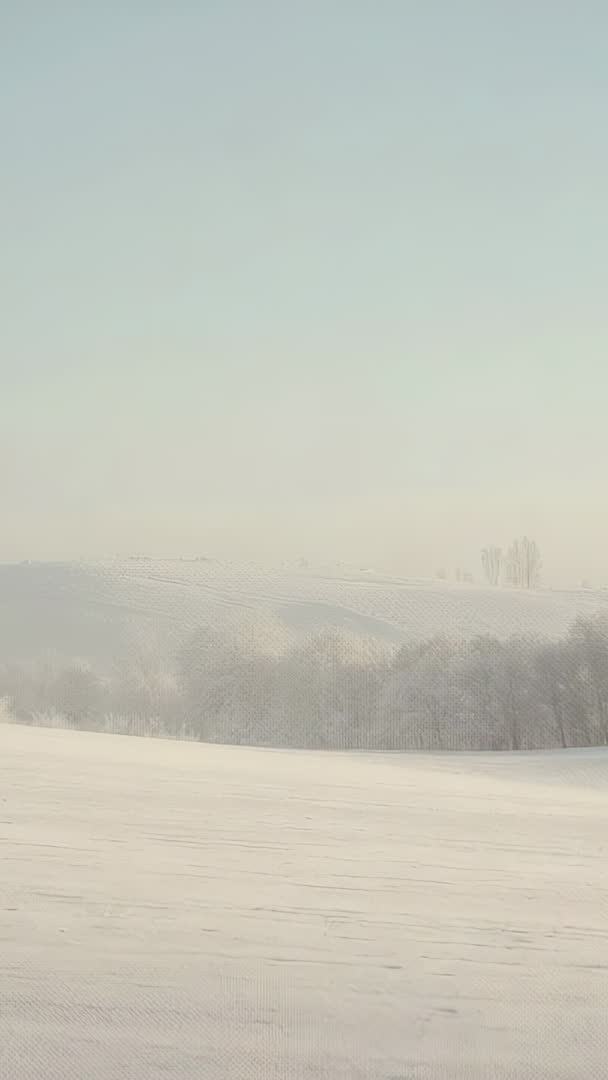 - Vertical winter video showing misty snow-covered fields, distant ridge and tree line