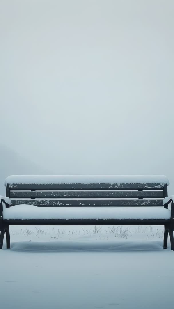 AI Generated Video. Showing solitary slatted park bench layered with fresh snow and light frost, framed by soft fog and muted horizon. Vertical composition placing bench at lower third and leaving broad negative space above for titles, logos, or captions. Snow detailing on seat and backrest adding texture while thin grass blades peek through along ground, creating quiet, minimalist winter mood. Suiting winter campaign background, social media vertical story or reel, cinematic opening shot, seasonal greeting or mindfulness sequence. Working well for overlaying text, logo reveal, lower-third captions, or slow-moving title cards. Advising gentle ambient soundtrack, subtle color grading toward cool tones, and slow pan or static hold to preserve meditative atmosphere.