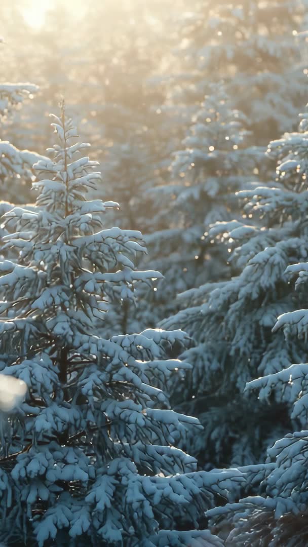 AI Generated Video. Vertical 9:16 video capturing sunrise backlighting on snow-covered fir branches, warm golden light filtering through conifer canopy. Shallow depth of field creating soft bokeh highlights, ice crystals glittering and snowflakes falling through frame. Mood evoking tranquil, crisp winter morning with subtle cinematic feel. Suitable for holiday campaigns, seasonal web banners, social media reels, mobile wallpapers, nature documentaries, relaxation and meditation content. Works well for looping backgrounds, slow-motion sequences, title overlays, and atmospheric establishing shots for travel or environmental projects. Recommended color grading to enhance warm highlights and cool blue shadows, and optional slow-motion playback to emphasize falling snow and sparkling frost.