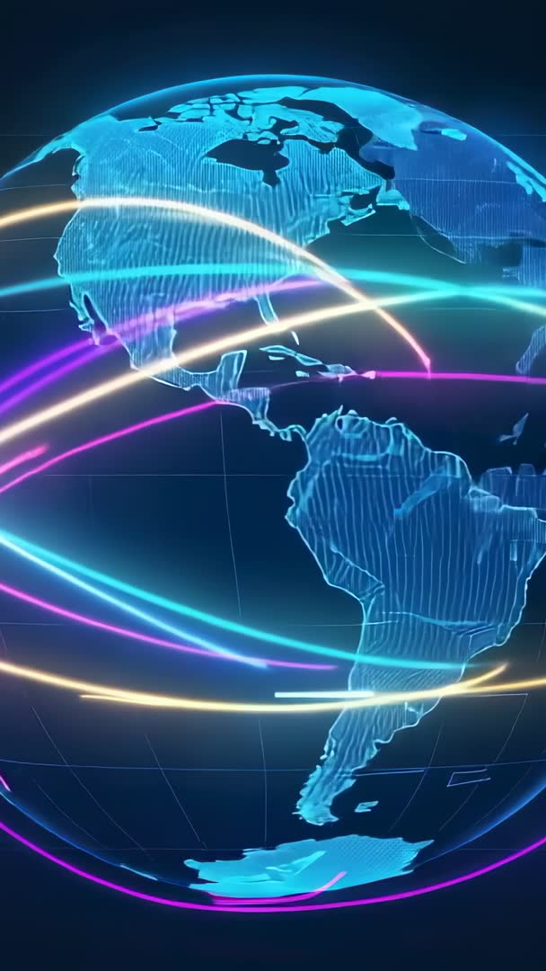 AI Generated Image. Video featuring vertical wireframe globe rotating in virtual space, neon arcs sweeping across hemispheres and connecting network nodes over North and South America. Light trails using cyan, magenta, and gold tones, creating high contrast futuristic aesthetic with subtle grid geometry. Lines and contours animating smoothly, offering loopable background for motion graphics and title sequences. Ideal for technology presentations, telecom commercials, cybersecurity promos, startup pitch decks, app intros, and social vertical platforms such as Instagram Reels and TikTok. Suitable for overlaying text, logos, lower thirds, and data dashboards while maintaining clear visual hierarchy. Working well for vertical 9:16 format and responsive mobile campaigns, fitting website hero backgrounds, conference displays, broadcast transitions, and advertising spots.
