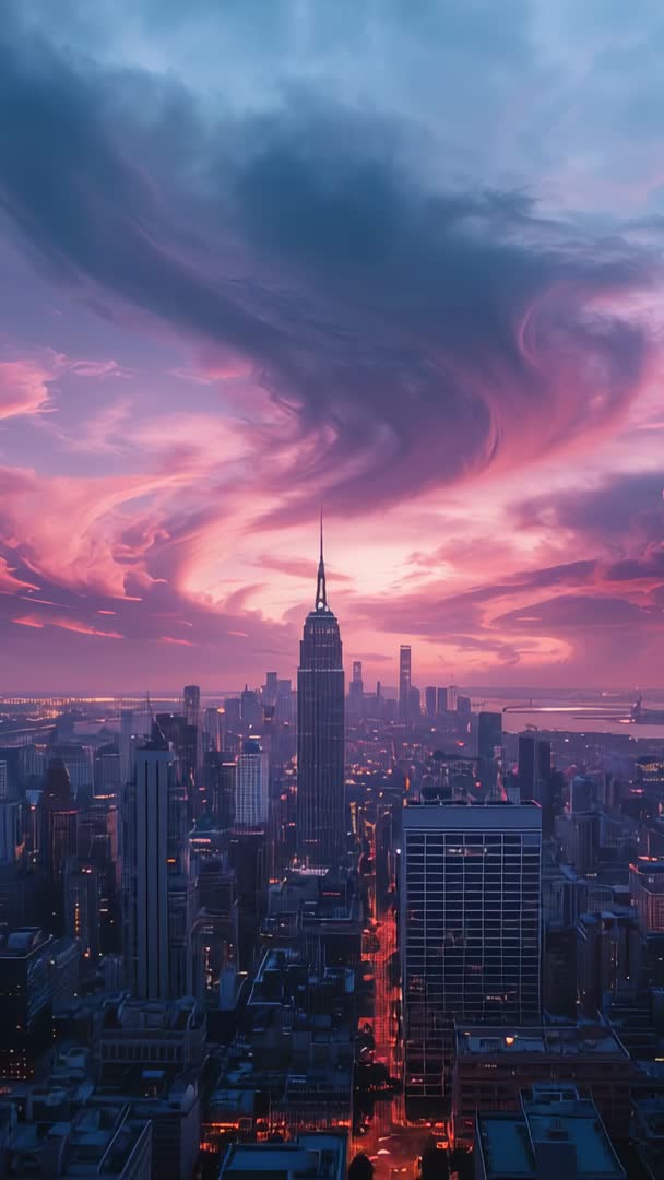 AI Generated Image. Vertical video showing zooming camera revealing dramatic spire rising over neon twilight cityscape with swirling pink clouds. Capturing cinematic contrast between glowing streets and moody sky, lights brightening while dusk deepening. Ideal for cinematic openers, social media reels, mobile wallpapers, travel and tourism promos, real estate marketing, and editorial features on urban architecture. Pairing well with ambient electronic tracks, orchestral swells, or voiceover narration. Delivering tall-aspect visual focus for mobile-first campaigns and vertical storytelling.