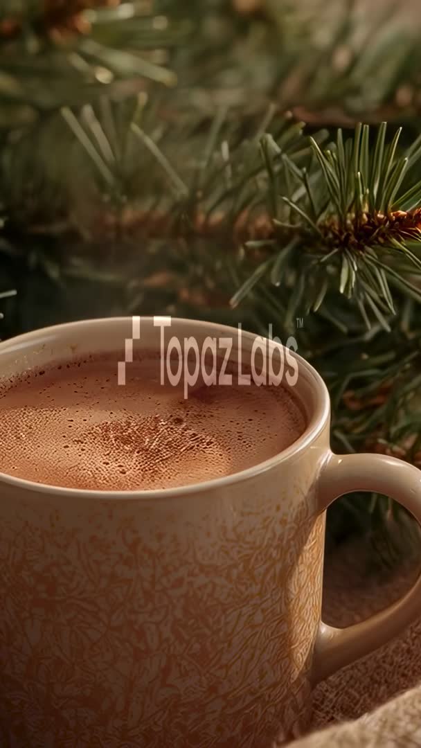 AI Generated Video. Vertical video opening with blurred pine branches and zooming into steaming mug of cocoa on textured cloth. Foam and cocoa powder dusting surface, steam rising gently and creating warm, inviting feel. Warm earthy tones and shallow depth of field creating cozy rustic mood ideal for winter and holiday content. Useful for social media reels, TikTok and Instagram stories, café menu video clips, seasonal blog intros, recipe tutorials, and lifestyle advertising. Frame composition leaving negative space at top for overlay text, caption, or logo placement. TopazLabs watermark present and may require removal before commercial use. High-resolution vertical format fitting Reels, TikTok, Stories, and web hero banners.