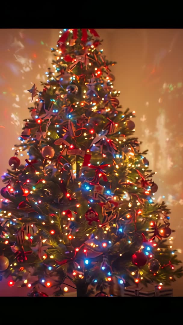 AI Generated Image. Showing vertical zooming shot of decorated Christmas tree, highlighting twinkling multicolor lights, red ribbons, glass baubles and reflective ornaments. Warm amber glow creating cozy festive mood for seasonal campaigns and holiday content. Camera performing smooth upward zoom, producing cinematic reveal that is ideal for mobile-first storytelling and short social clips. Recommending use for social media reels, Instagram and TikTok stories, mobile ads, holiday greeting overlays, ecommerce product showcases, digital signage and website hero loops. Suggest creating short seamless loop (6 to 15 seconds) for repeating background, adding soft instrumental music and overlay text in top or bottom safe area to preserve focal point. Color grading tips: boost warm tones, slightly increase highlights for sparkle, add gentle vignette for depth. Delivering mood-perfect visual for commercial campaigns, retail promotions and lifestyle seasonal content.