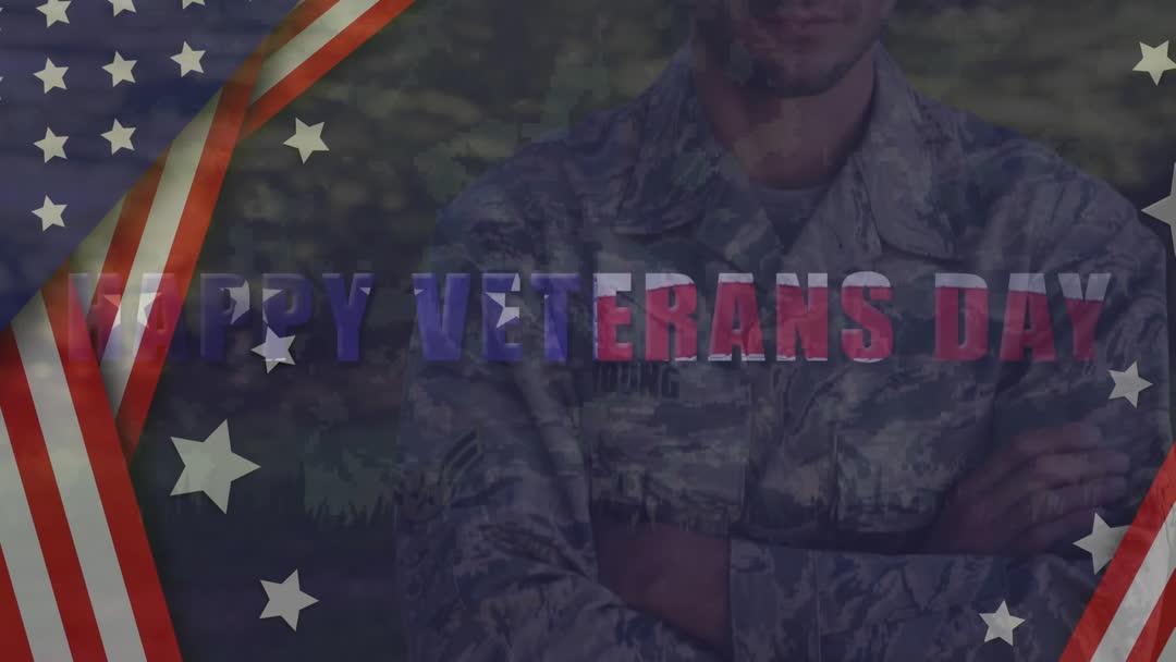 The background features a person in military uniform framed by an overlay of American flags and a starry design, with bold 'Happy Veterans Day' text central. This is ideal for use in celebrating Veterans Day across social media banners, educational presentations, or commemorative events focused on honor and patriotism.
