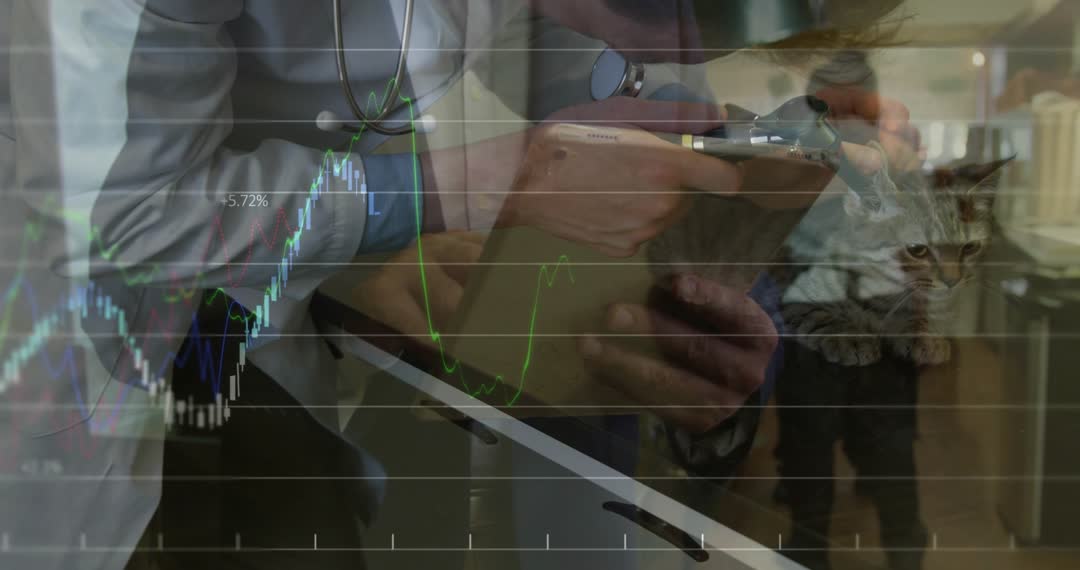 Veterinarian simultaneously examining a cat while analyzing financial data on a tablet showcases merging of healthcare with technology and analytics. Suitable for articles on modern veterinary practices, healthcare tech advances, or educational content on veterinary diagnostics.