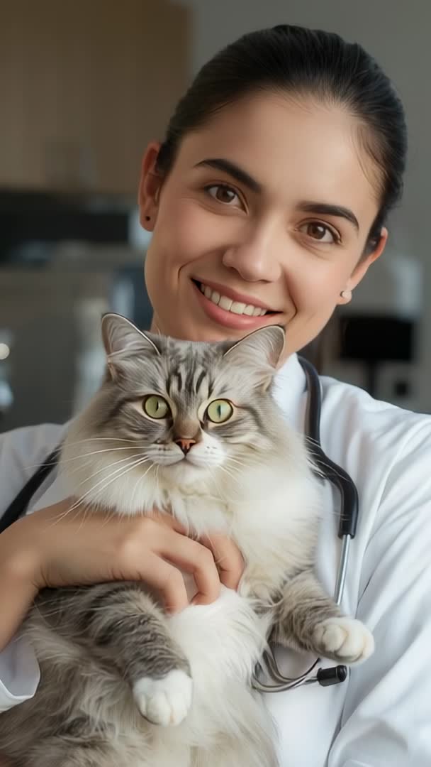 AI Generated Video. Vertical video showing veterinarian cradling grey white longhair cat in clinic, smoothing fur and smiling. Stethoscope visible around neck, close-up framing highlighting calm feline and gentle handling. Visual tone conveying trust, compassion, and professional pet care. Use for veterinary clinic marketing, pet health education, social media reels and stories, telemedicine promotions, pet insurance advertising, blog headers, staff training clips, and editorial pieces about animal welfare. Suggest pairing with warm music, soft color grade, and overlay text for appointment booking, feline care tips, or call-to-action messaging. Ideal for mobile-first content such as Instagram Reels, TikTok, and YouTube Shorts or website hero panels and in-practice waiting room displays.