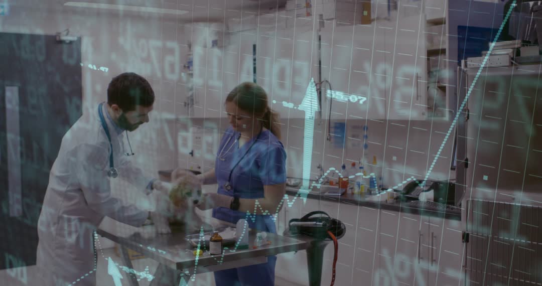 - Veterinarian Team Assessing Puppy with Financial Data Overlay