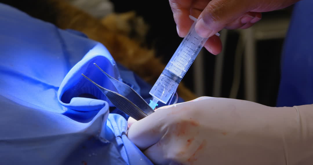 Veterinary surgeon skillfully performing a surgical procedure on a dog, showcasing the precise use of a syringe in an operating room. Suitable for illustrating veterinary practices, surgical techniques, and modern medical procedures in animal healthcare.
