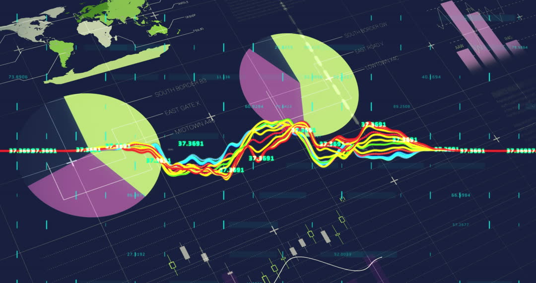 A colorful and dynamic representation depicting animated statistical data overlaid on a grid network background. Featuring lines, grids, and pie charts with vibrant styling, ideal for illustrating concepts regarding data analysis, financial markets, or business technology strategy presentations. Useful in presentations focused on statistical modeling, financial market insights, or academic education on data sciences and technology.