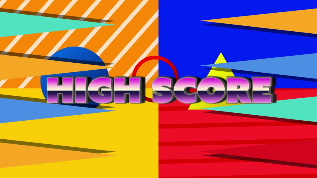 Features bold 'High Score' text over vibrant geometric shapes, blending playful and retro design elements. Perfect for use in gaming content promotions, digital interfaces, or social media campaigns centered on excitement and entertainment.