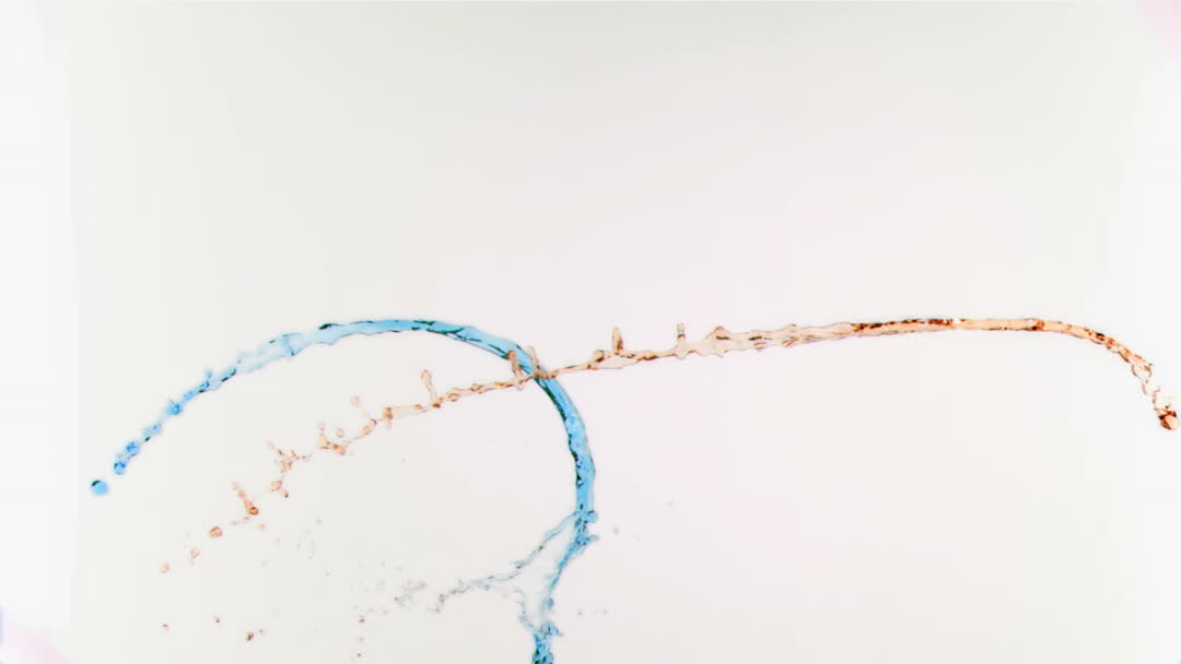 Ribbons of blue and orange water dynamically captured mid-air on a white background. Great for use in designs involving abstract concepts, physics visualizations, or promoting creativity and innovation. Perfect for backgrounds, presentations, or explainer videos emphasizing fluidity and dynamic motion.