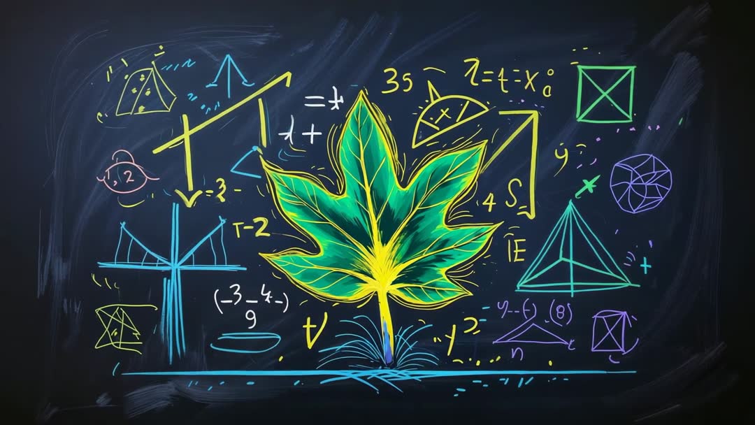 AI Generated Image. This video depicts a chalkboard featuring a prominent green-yellow leaf surrounded by various colorful mathematical sketches. It presents an artistic blend of nature and science with vibrant visuals, making it highly suitable for educational materials such as textbooks, online courses, or academic presentations. The lively representation encourages an innovative approach to learning, sparking curiosity in students and educators alike.