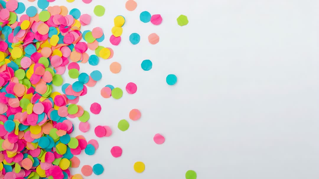 AI Generated Image. High-energy 4K video clip showing colorful circular confetti spilling and scattering from left side into open white space. Top-down flatlay perspective providing broad negative space on right for overlaying text, logo, or lower-third graphics. Bright neon palette of pink, blue, green, yellow creating festive, playful mood suitable for celebration themes. Useful for party invites, event promos, holiday greetings, social media intros, product launch teasers, website hero banners, livestream overlays, and broadcast bumpers. Clip working well as loopable background or transition element; simple editing allowing color grade and speed adjustments. Ideal for designers and editors needing quick festive visual to enhance marketing, greeting, or announcement content.