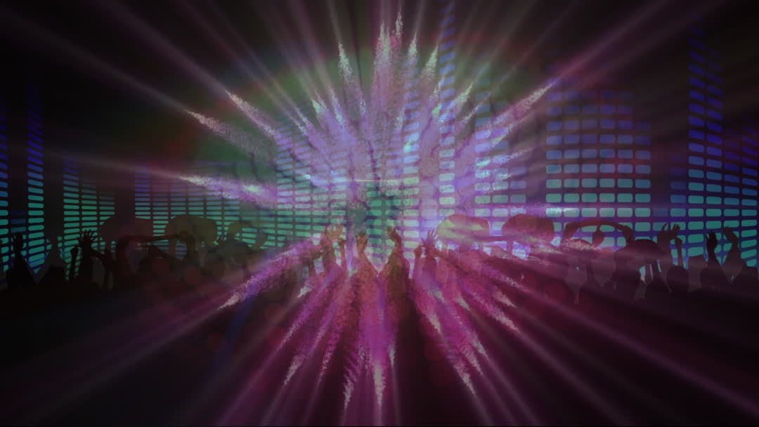 Vibrant animation featuring colorful glowing lights over silhouettes of dancing people creates a lively party atmosphere. Ideal for use as a background in music events videos, promotional material for nightclubs, and electronics or entertainment industry advertising. It captures the excitement of nightlife and dynamic energy of social gatherings.
