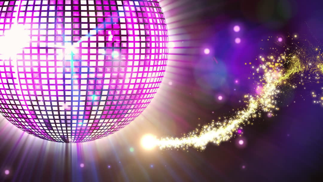 This dynamic and colorful scene captures a lively atmosphere perfect for illustrating the excitement of a disco-themed event. Swirling golden glitter trails collide with a vibrant, spinning disco ball, evoking videos of festive celebrations, nightclub parties, or dance floor excitement. This animation is ideal for use in advertisements targeting nightlife events, dance parties, or themed event promotions.