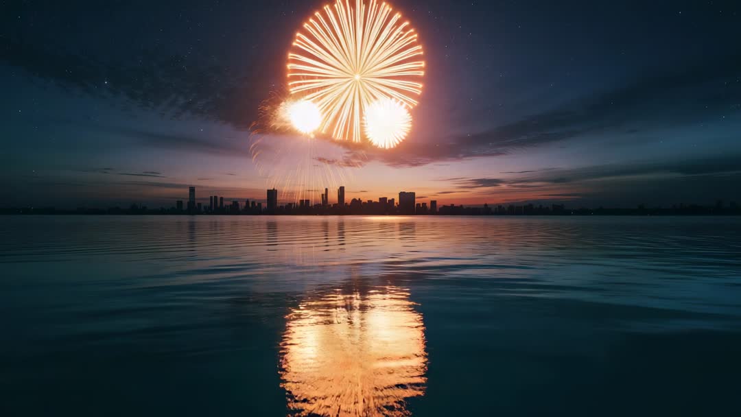 AI Generated Image. This video captures an electrifying fireworks display expanding across a night sky, silhouetted against a distant city skyline at dusk. The vibrant colors warmly reflect across the calm waters, creating a mirrored spectacle of illumination. Ideal for events or celebrations, this theme suits an urban New Year's Eve party or Fourth of July announcement, enhancing a sense of festivity and grandeur.
