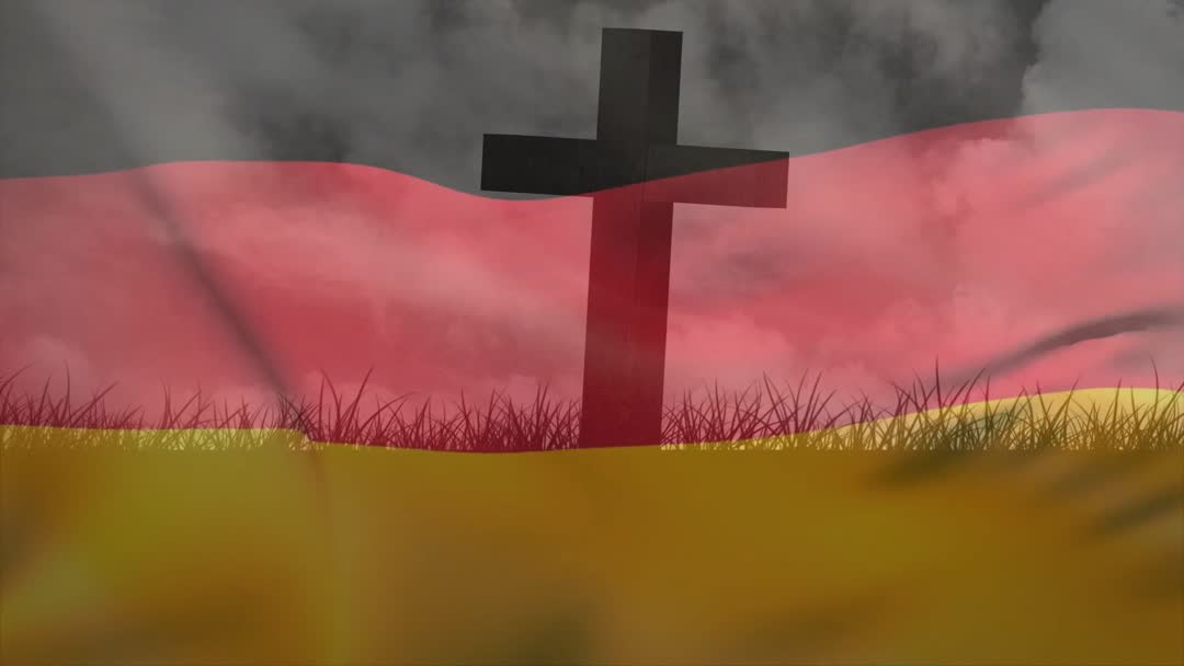 A dramatic scene with the flag of Germany waving with a cross silhouette in the foreground. The contrast between the vibrant red and yellow of the flag and the heavy, ominous clouds above adds tension and drama, making this video ideal for themes of nationalism, religion, history, or resilience. It can be used in editorials, presentations, or artistic projects exploring the interplay between nationhood and spirituality.