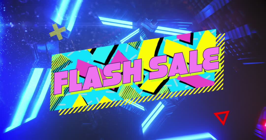 Animated design features flashy 'Flash Sale' text on colorful geometric background, ideal for retail discount promotions or advertising. Use in digital marketing campaigns to capture attention quickly. Perfect for social media posts and seasonal sales announcements to entice potential buyers.