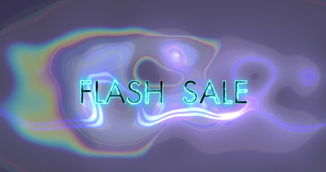 An eye-catching video featuring the phrase 'Flash Sale' illuminated with an LED glow against a holographic liquid background. The vibrant and dynamic colors suggest excitement and urgency, making it suitable for online promotions, advertisements, social media graphics, and marketing campaigns emphasizing special sales events or deals.
