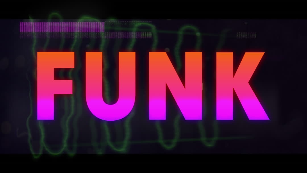 Digital animation features 'FUNK' word with vibrant pink and orange hues against dynamic abstract background. Perfect visual for music promotion, dance event poster, or electronic playlist cover. Ideal for use in creative marketing materials featuring modern, technology-inspired graphics conveying energetic mood.