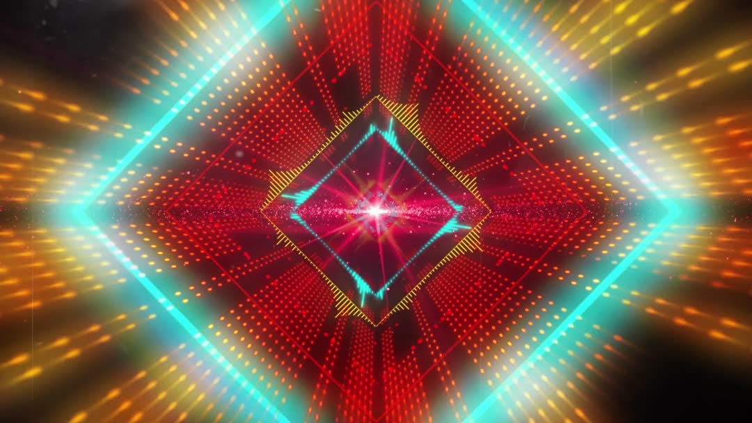 Animated multicolored neon lights create a vibrant tunnel effect with symmetrical geometric patterns. Ideal for modern digital art projects, visual effects in music videos, or backgrounds for creative tech-related presentations.