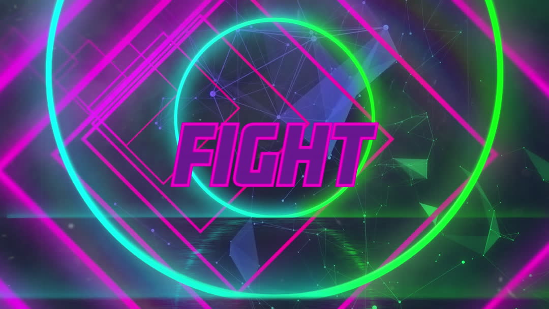 Bright visual features the word 'FIGHT' prominent in pink, surrounded by neon geometric shapes and outlines. This digital visual blends neon colors with a futuristic design, making it fitting for gaming backdrops, esport tournament promotions, or online digital media headers emphasizing energetic themes in virtual environments.