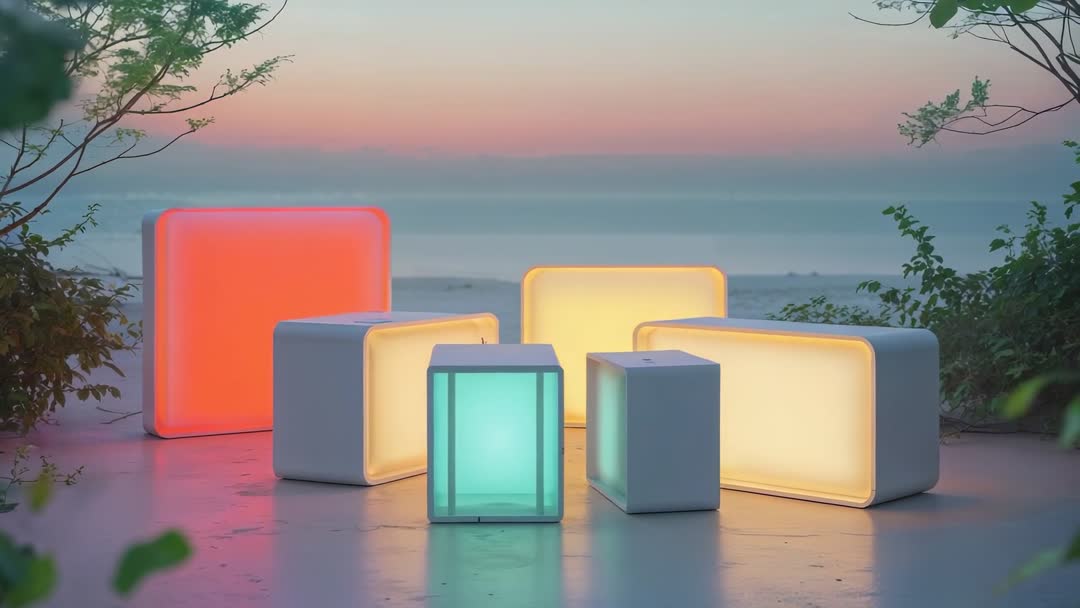 AI Generated Video. This scene captures inventive geometric LED blocks glowing in serene pastel shades, beautifully silhouetted against a scenic sunset by the sea. It evokes a modern and tranquil atmosphere, ideal for conveying themes of ambiance, serenity, and futuristic decor possibilities. This is suitable for videory related to home design, innovative lighting solutions, events planning, or creating futuristic, aesthetic marketing materials.