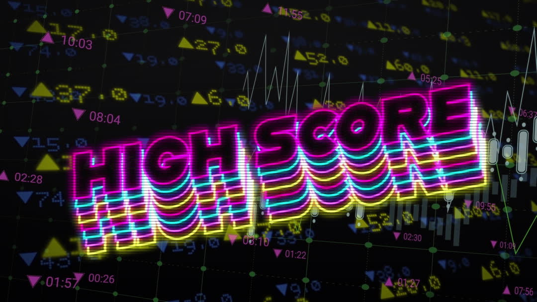 This colorful graphic displays the words 'High Score' over a background featuring digital stock market graphics, merging the playfulness of video games with the serious setting of business analytics. Suitable for use in projects related to game achievements, financial presentations, or marketing materials aiming to blend the excitement of gaming with investment strategies.