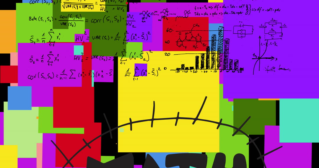 Digital illustration depicts intricate mathematical equations layered over bold, colorful squares, sparking an engaging and vibrant presentation. Could be used in educational materials, scientific presentations, or decor for academic settings, inspiring interest in mathematics and digital technology.