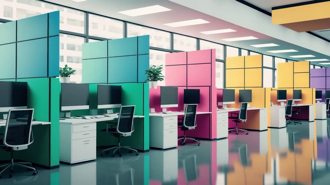 AI Generated Image. The office is visually striking with green, pink, yellow, and purple partitions and large windows. This video highlights a modern, creative work environment perfect for showcasing contemporary office design. Suitable for articles on modern corporate workspaces, design inspiration, or advertisements for office furniture and decor brands.