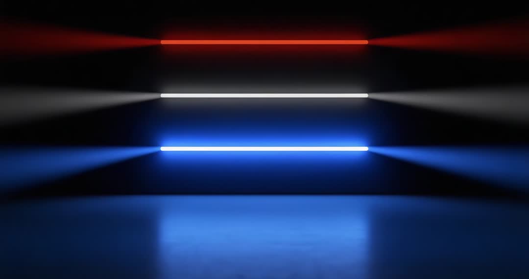 AI Generated Image. This AI-generated video frame captures an array of three horizontal neon bars glowing brightly in a darkened room. Each bar produces a vivid beam in red, white, and blue hues, reflecting across the shiny surface below. The composition's symmetry and vibrant colors create a futuristic and modern atmosphere perfect for backgrounds in creative projects, digital media, or promotional content emphasizing innovation and technology.