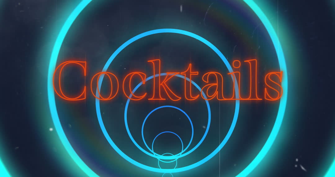 Dynamic animation features an eye-catching neon orange cocktails sign transitioning through circular tunnel. Created for businesses showcasing nightlife, bars, and service industries. Suitable for marketing, advertising, or creative media needing attention-grabbing visuals.