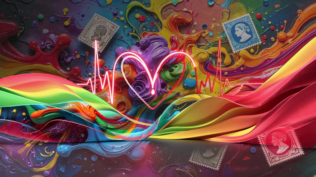 AI Generated Image. In this mesmerizing video, dynamic ribbons of vibrant pigments intertwine with drifting postage stamps set against an ethereal backdrop, creating an impactful, lifelike representation of a pulsing neon heart viewed alongside an oscilloscope-like electric ECG wave. This digital masterpiece, awash with emotional resonance and symbolic videory of vitality and health, is ideal for use in artistic projects, thematic design elements in campaigns focused on joy, beauty, wellness, or even promotional pieces for health-related content or art exhibitions online.