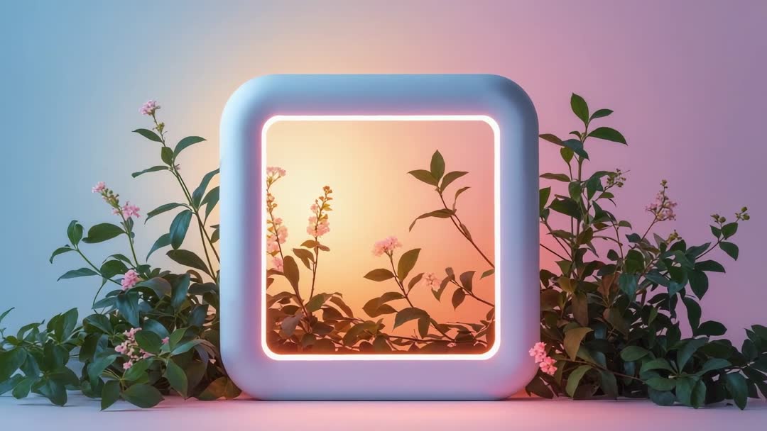 AI Generated Image. This modern composition features a rounded-square frame illuminated by vibrant neon in pastel hues, surrounded by delicate blossoms and leaves. Perfect for advertising, prints, or web design projects that aim to combine tranquility and energy, the video encapsulates a blend of digital art with nature. Ideal for use in branding, backgrounds, lifestyle blogs, or interior design concepts.