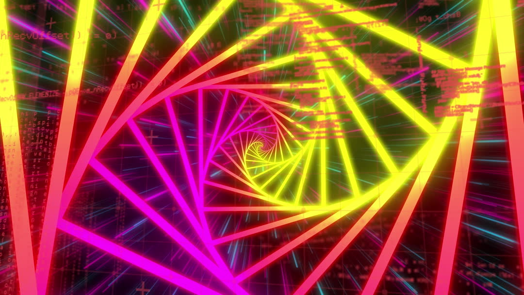 Neon spirals rotating against a backdrop filled with data symbols creates a vivid, futuristic vibe. Perfect for themes related to technology, cyberpunk visuals, digital innovation, and abstract artistic presentations. Great for use in backgrounds, banners, or presentations showcasing technology trends and digital art.