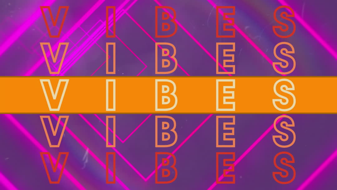 Dynamic video featuring bold 'Vibes' text in neon colors over a vibrant, patterned background. The eye-catching contrast and glowing elements create a retro-inspired feel, ideal for modern digital media or promotional content needing a lively, upbeat atmosphere.