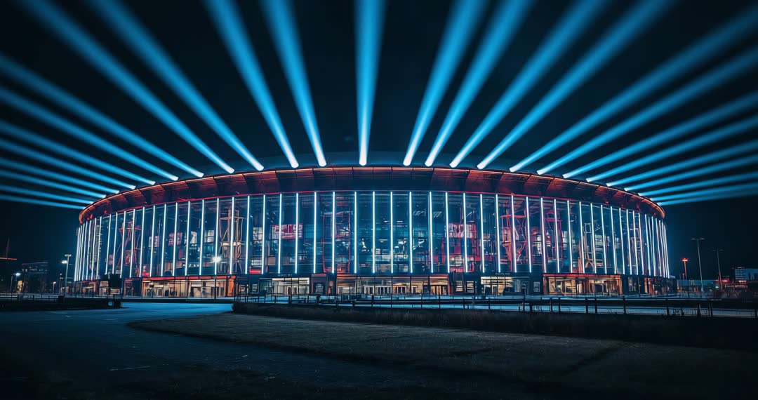 - Vibrant Nighttime Display at Circular Stadium with Light Beams