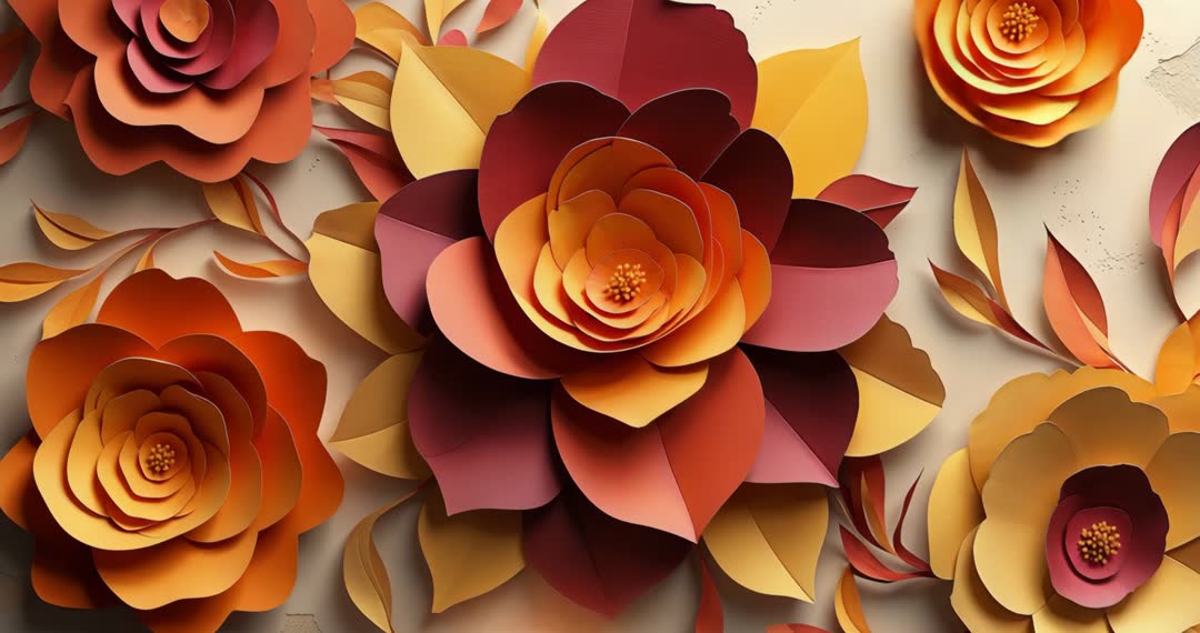 AI Generated Image. Paper flowers in warm tones of orange, red, and yellow unfold gracefully against a rustic beige wall. Leaves accentuate the craftsmanship of abundant blooms, while a camera pans to reveal intricate details. Ideal for illustrating home decor ideas, rustic-themed weddings, and artistic crafts inspiration, this vibrant display captures the ingenuity of handmade floral arts.