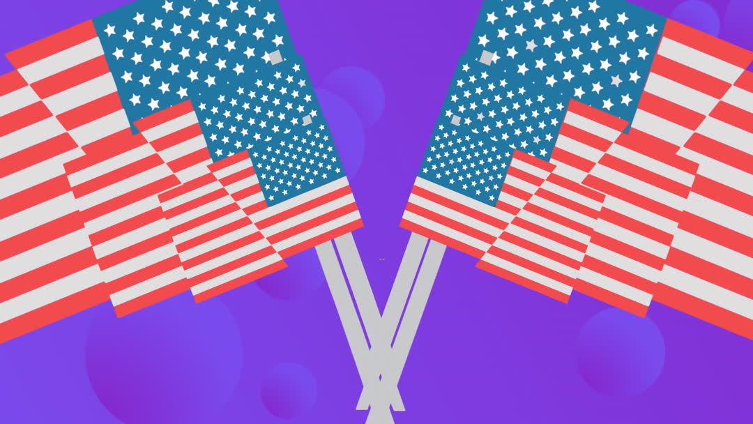 Patriotic animation with American flags multiplying and moving across a vibrant purple background adorned with spheres and dots. Perfect for digital content celebrating American independence, patriotism, or for illustrative purposes in national events and educational materials on American history.