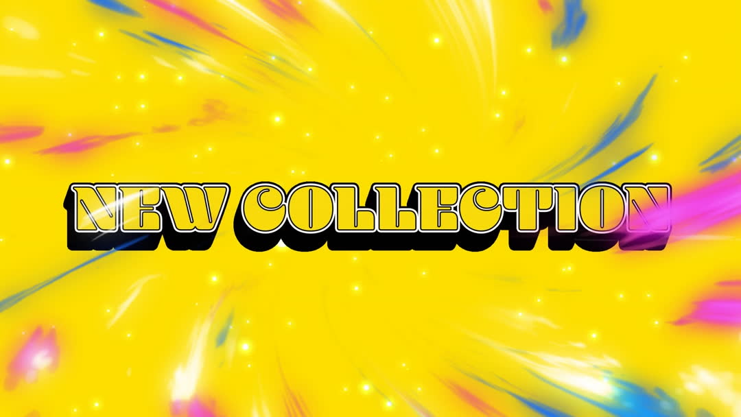 Yellow background with bold 'New Collection' text amid colorful abstract shapes creating an energetic and eye-catching look. Well-suited for retail promotions, online marketing campaigns, and social media banners aimed at grabbing consumer attention with vivid graphics and dynamic text styling.