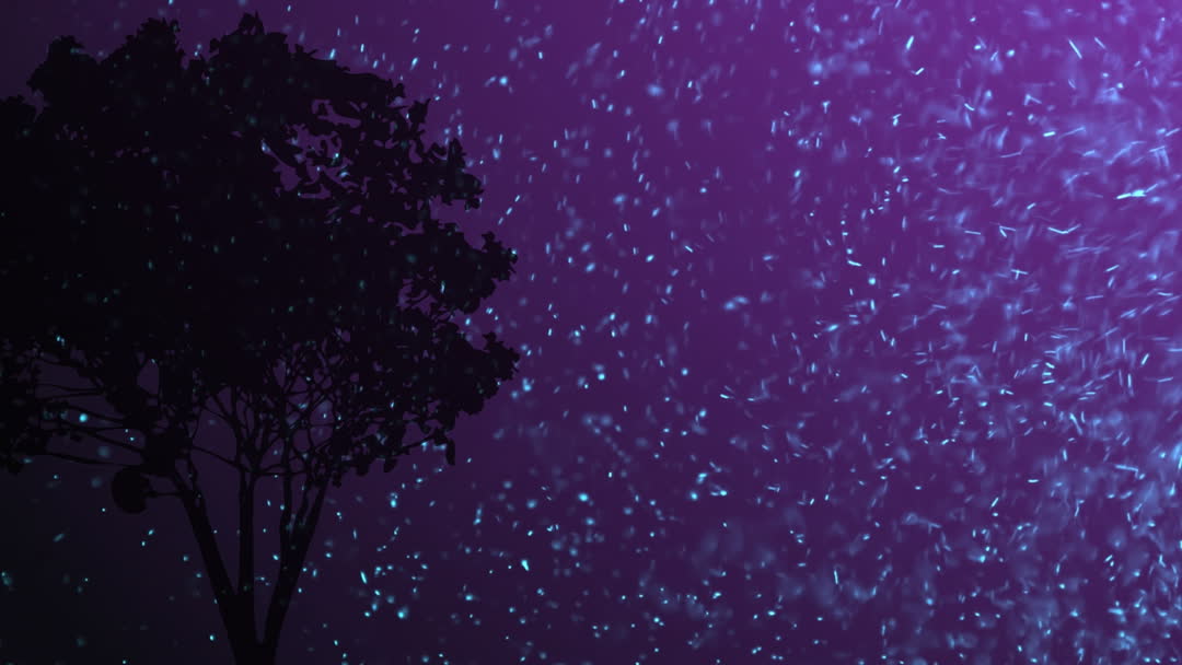Featuring a dark silhouette of a tree against a richly colored purple backdrop, this vibrant scene is filled with floating light particles. The digital and abstract elements create an ethereal quality suitable for use in animations, backgrounds, or creative design projects. Ideal for adding a mysterious and mystical ambiance to fantasy-themed videos, virtual reality settings, and digital artworks.