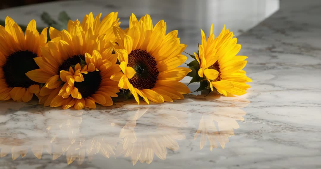 AI Generated Video. This frame displays a vibrant sunflower bouquet placed on a polished marble countertop. Natural sunlight beautifully enhances the contrast between the bright yellow petals and the intricate veining of the surface, giving a warm and elegant feel. Ideal for use in content related to home decor inspiration, indoor gardening, or floral arrangement tutorials.