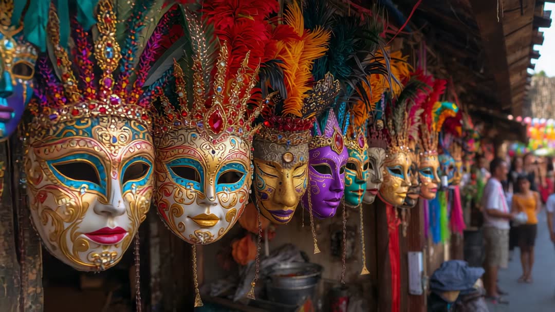 - Vibrant Venetian Masquerade Masks Hanging in Busy Market Alley, Shoppers Browsing Carnival Crafts