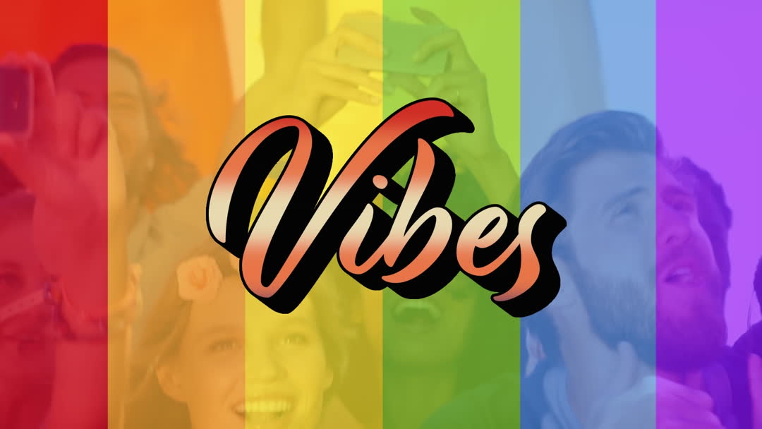 Colorful typography featuring 'Vibes' overlays a vibrant rainbow flag and diverse group. Suitable for celebrating LGBTQ pride and inclusivity themes on social media, events, or digital marketing. Symbolizes diversity, joy, and community spirit.